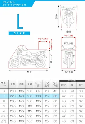 | サイズ | 大きすぎる⇒扱いづらい!ちょっと大きめがベスト! 小さすぎる⇒車体をしっかりカバーできない! ≫バイクカバーサイズの選び方 |