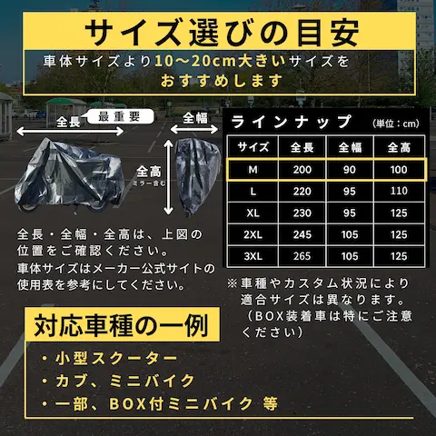 お持ちのバイクのサイズをよく確認して、カバー選びをしましょう!
