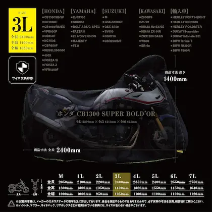 「400ccだからXLサイズで大丈夫」などと、安易に決めると失敗しやすい車種なので、サイズは全長基準でしっかり確認しましょう。