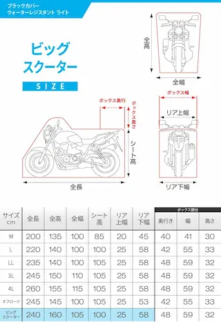 ※リアボックス等装着車はワンサイズアップ - 200~300D程度の生地の厚さがオススメ。耐久性と扱いやすさのバランスがベスト。